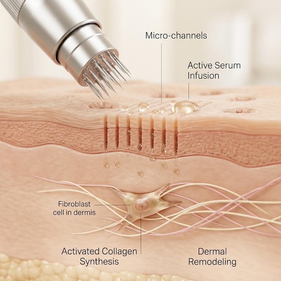 During microneedling, these micro-channels act as a direct delivery system. We apply professional-grade bio-active peptide serums that travel deep into the tissue while the "channels" are open. This combination significantly boosts hydration and gives the skin a firmer, more resilient feel that topical creams alone simply cannot match.